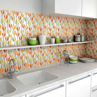 Для кухни — керамогранит с имитацией мрамора, бетона или дерева на пол, для фартука — яркие моноцвета или мелкоформатная плитка под кабанчик