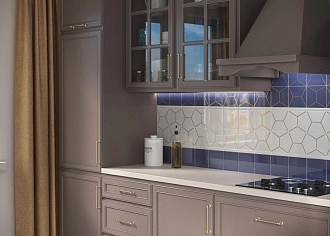 Для кухни — керамогранит с имитацией мрамора, бетона или дерева на пол, для фартука — яркие моноцвета или мелкоформатная плитка под кабанчик