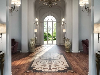 Для прихожей и гостиной — крупноформатный керамогранит под камень или паркет, матовый или лаппатированный, класс износостойкости PEI IV–V