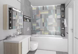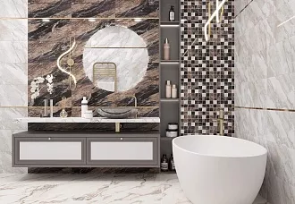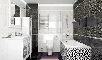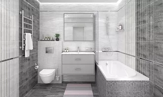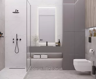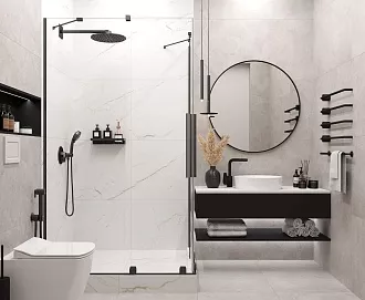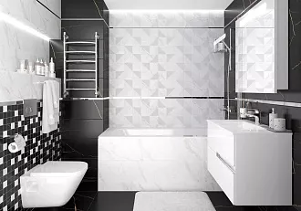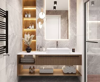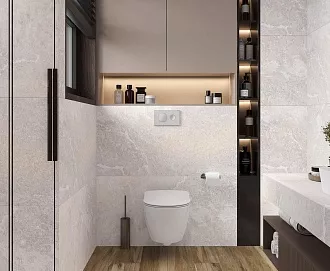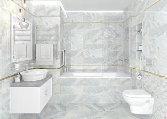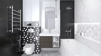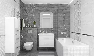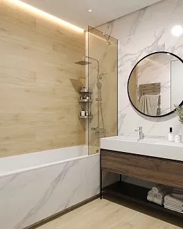 - Сочетание с сантехникой и мебелью. Светлые тона визуально расширяют пространство, темные и текстурированные добавляют глубину и характер.