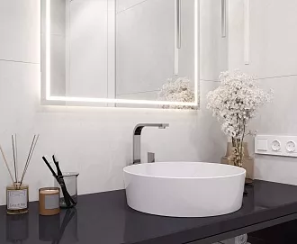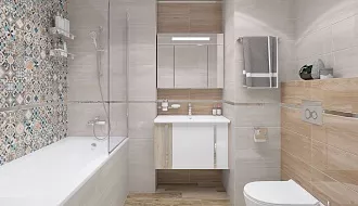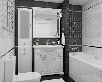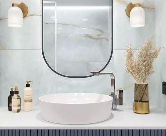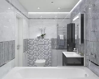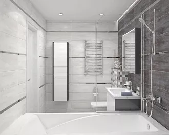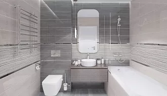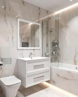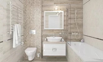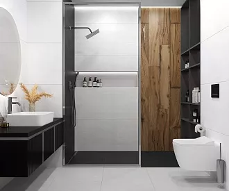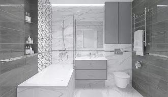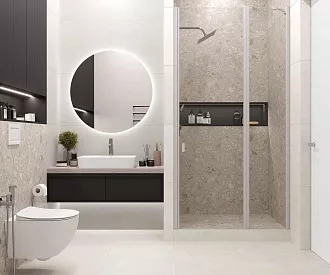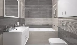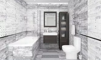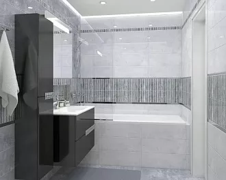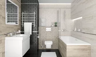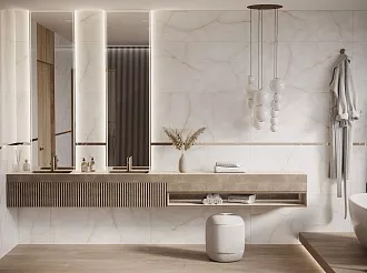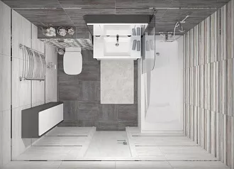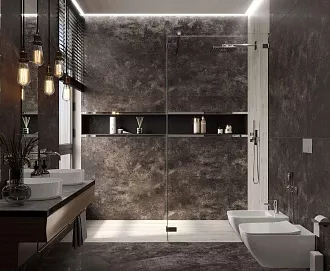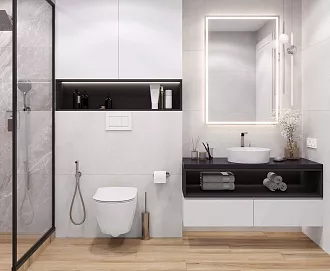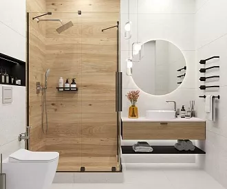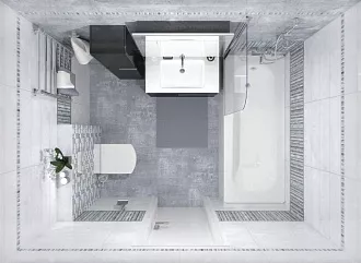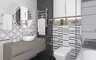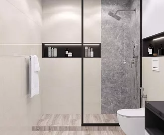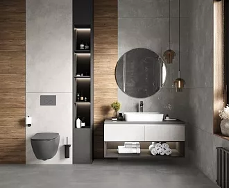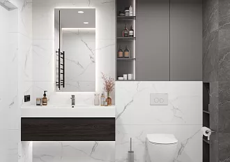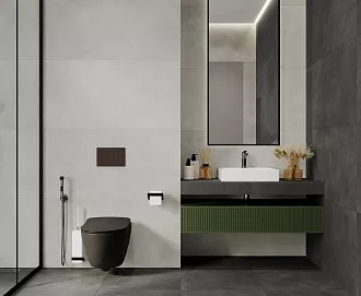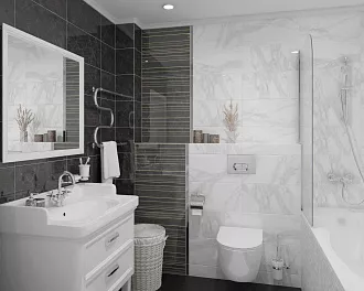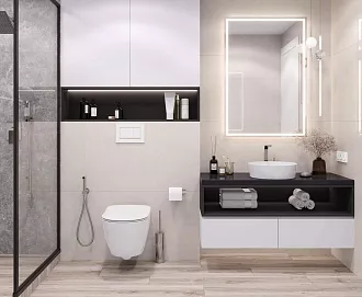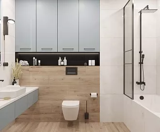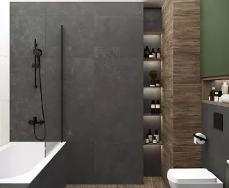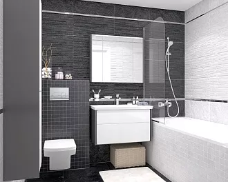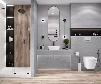 - Сочетание с сантехникой и мебелью. Светлые тона визуально расширяют пространство, темные и текстурированные добавляют глубину и характер.